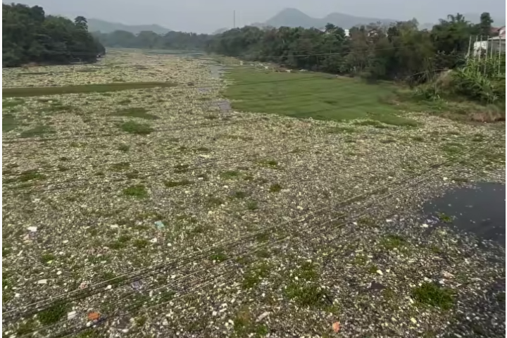 Dalam video yang diunggah penggiat lingkungan @pandawaragroup, tampak tumpukan sampah menutup hampir seluruh aliran di bawah jembatan Bakan Sapan (BBS) yang menghubungkan Cililin-Batujajar KBB.