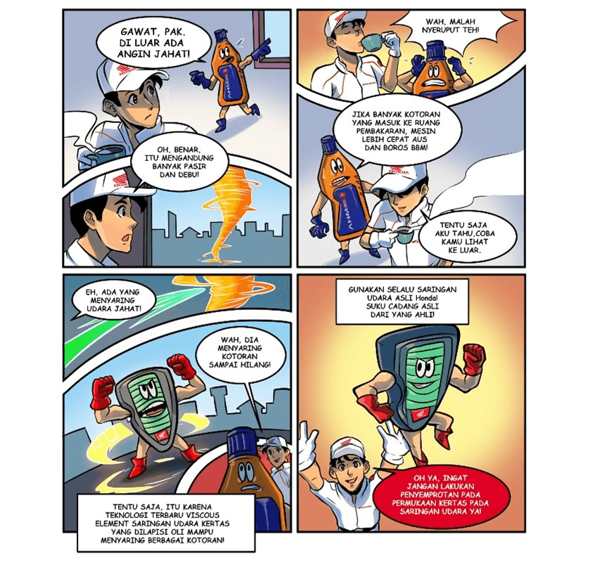 Saringan udara Honda memakai jenis paling kekinian adalah Viscous Part. Viscous Part yaitu saringan udara kertas yang dilapisi oli pada permukaan luarnya, yang mempunyai fungsi untuk menyaring udara dari debu serta kotoran yang akan masuk ke throttle frame secara lebih sempurna.